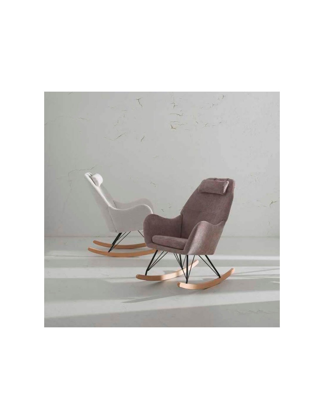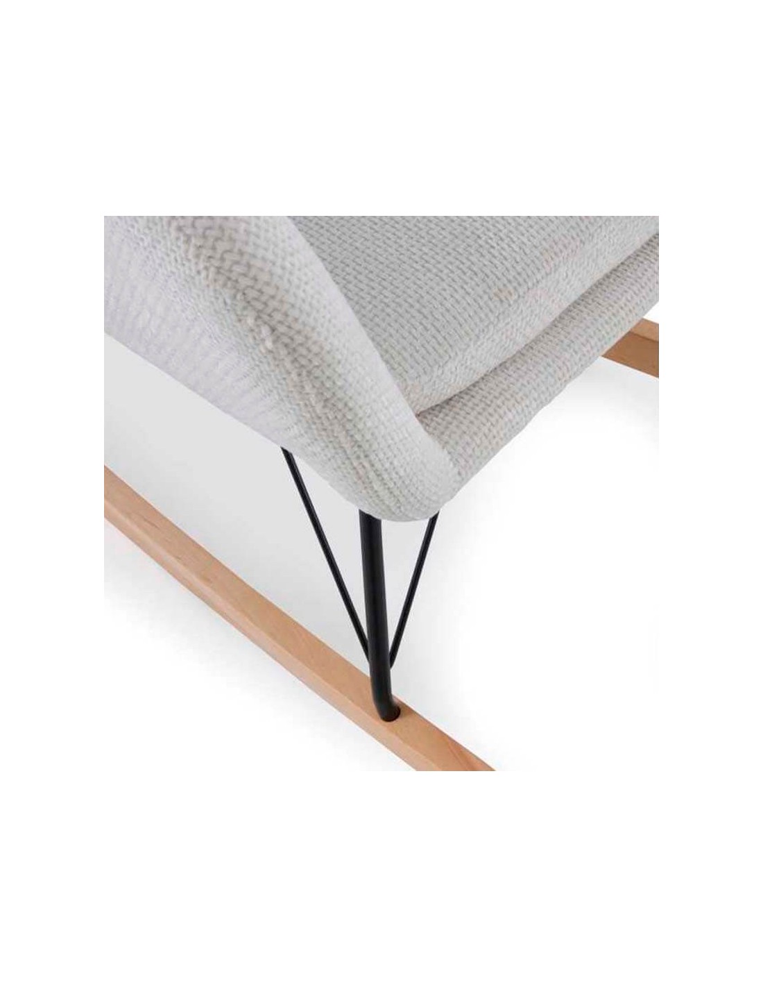 Sillón mecedora de estilo contemporáneo o nórdico. Para dormitorio o salón. Tapizado 100% poliéster, chenilla en color marrón o blanco, de tacto suave. Asiento de cojín desenfundable. Patín de madera de haya en color natural, con protector antirayadura de suelo.