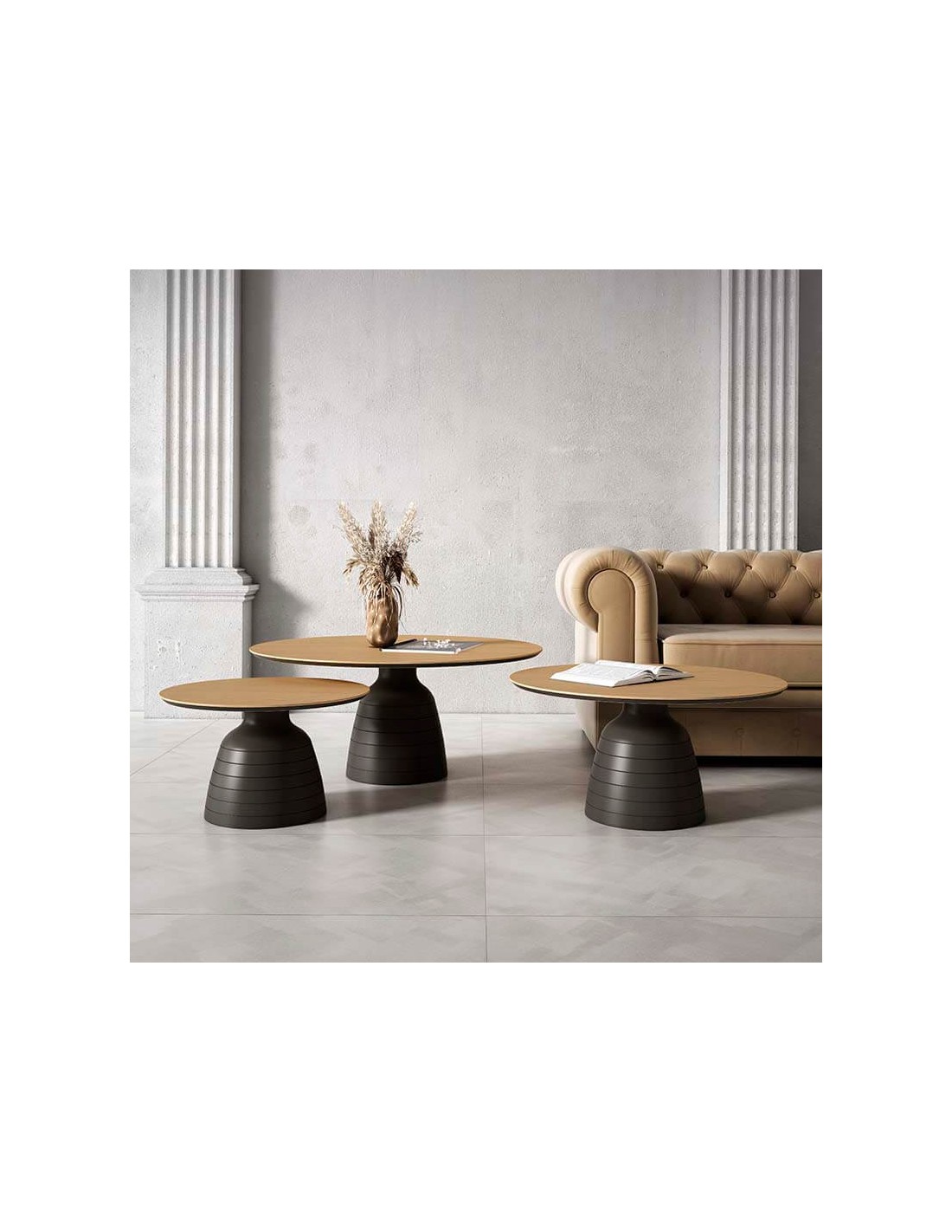 Mesa de centro redonda para salones de estilo contemporáneo. De diseño italiano, está disponible en varias medidas y alturas. Compuesta por una elegante base de madera lacada con formas curvas y una bonita encimera chapada en madera de primera calidad. Varias combinaciones disponibles.
