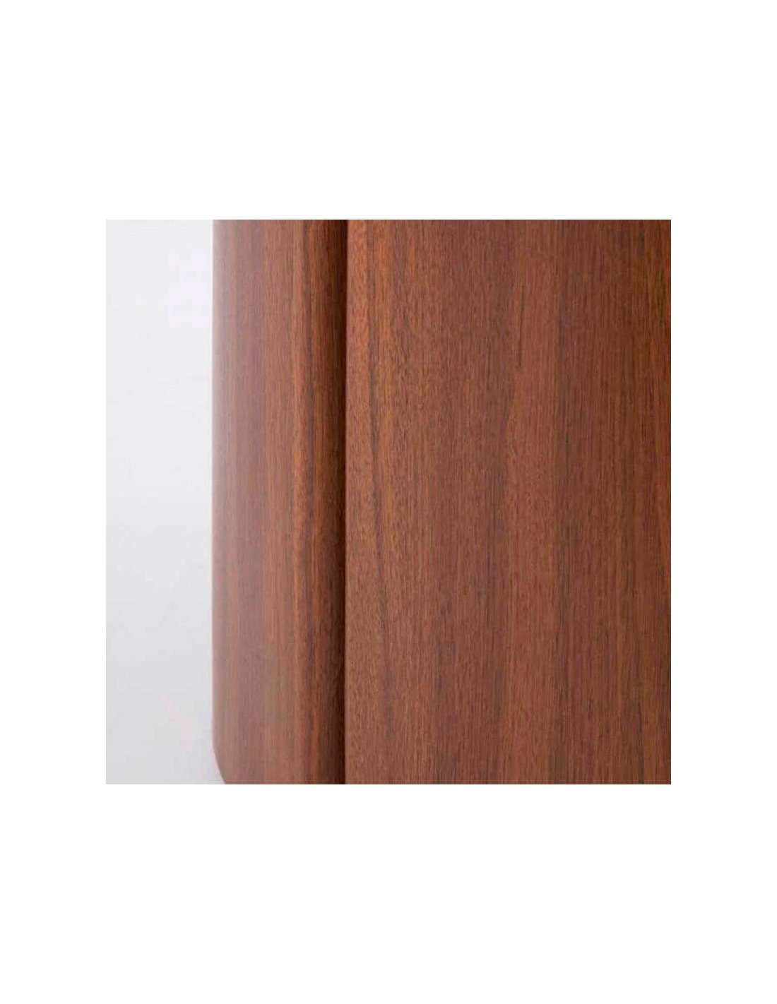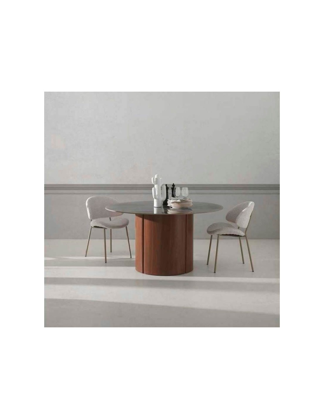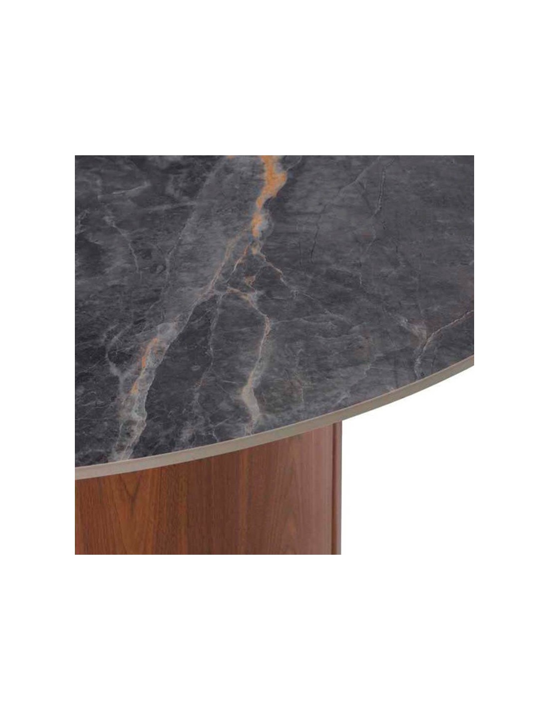 Mesa redonda para comedor contemporáneo, de estilo Boho o mediterráneo. Formada por una base cilíndrica de MDF chapado en madera de roble y una encimera con acabado cerámico en mármol gris oscuro, de 1 cm de grosor. Disponible en dos medidas.