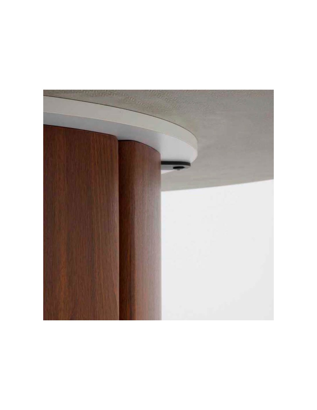 Mesa de comedor redonda con base de madera y tapa cerámica. Tamaño grande.