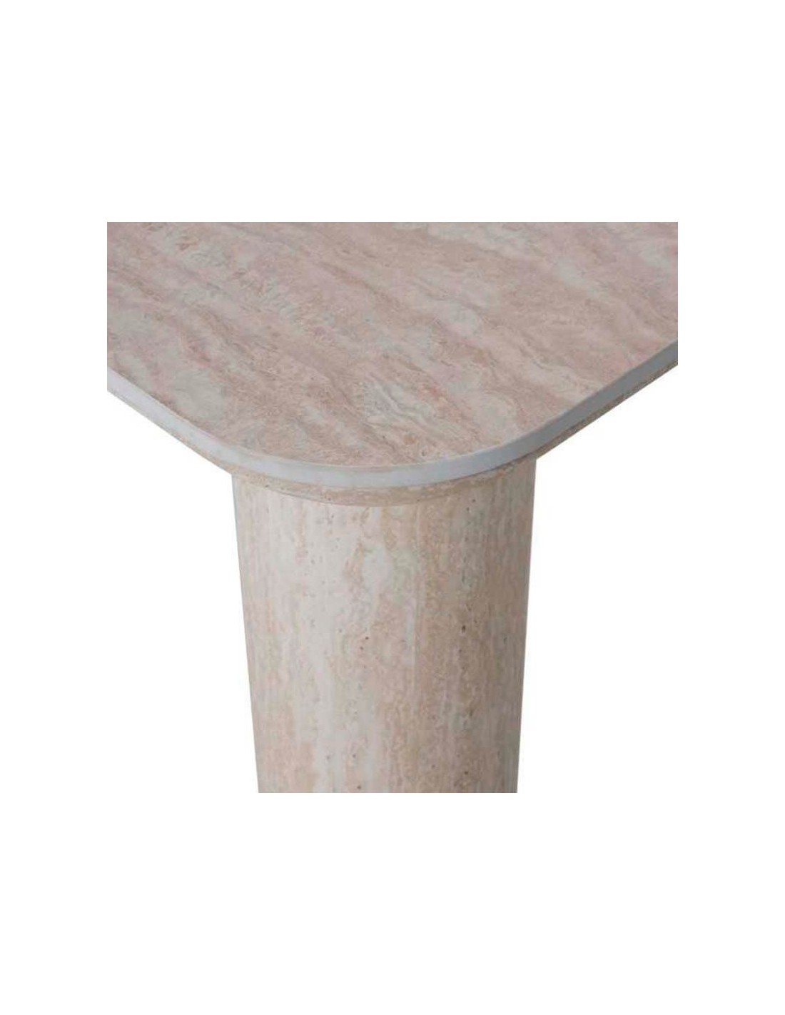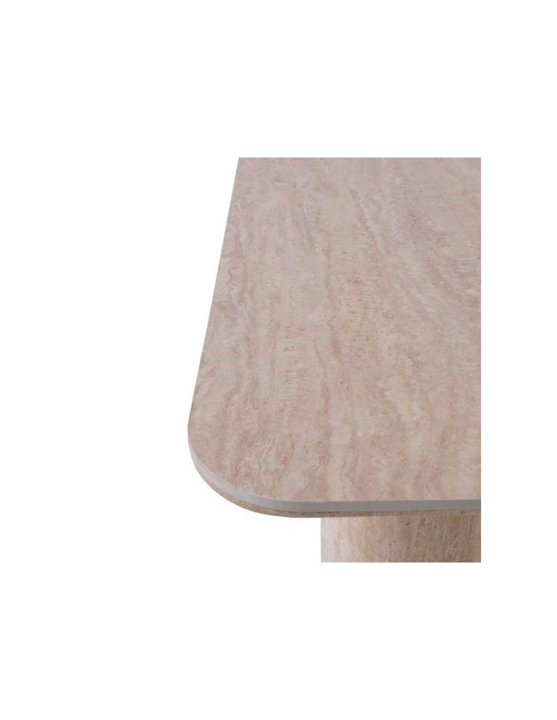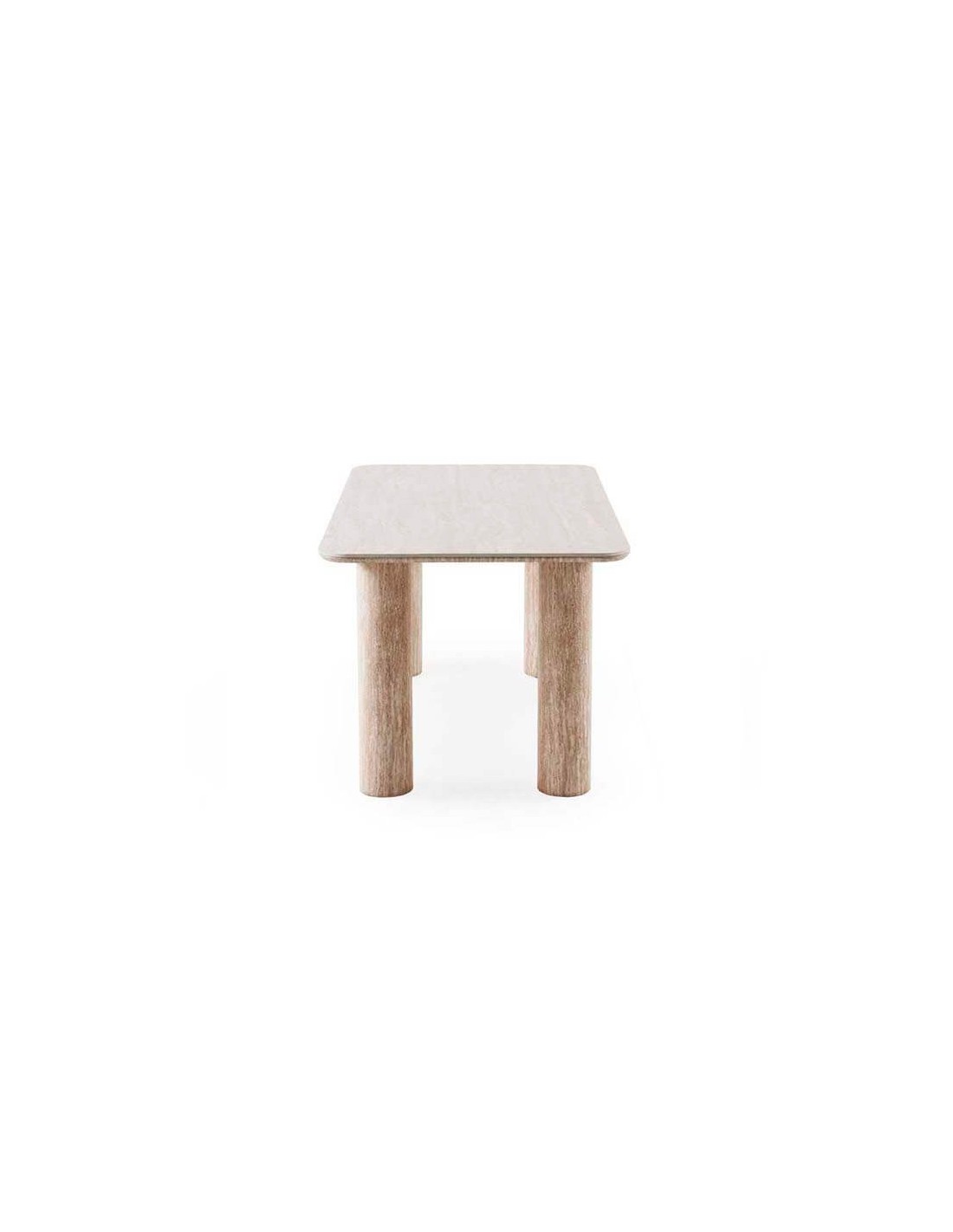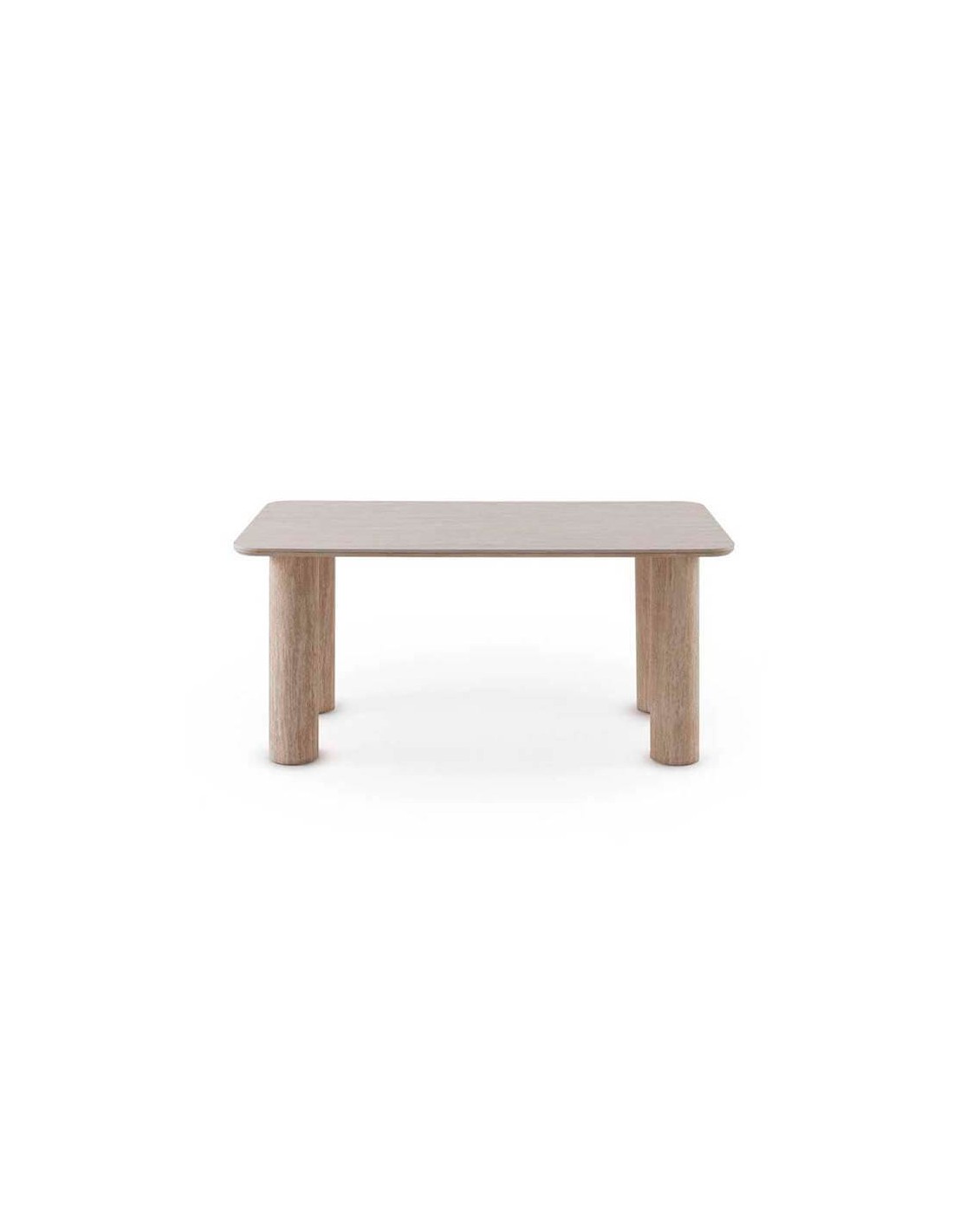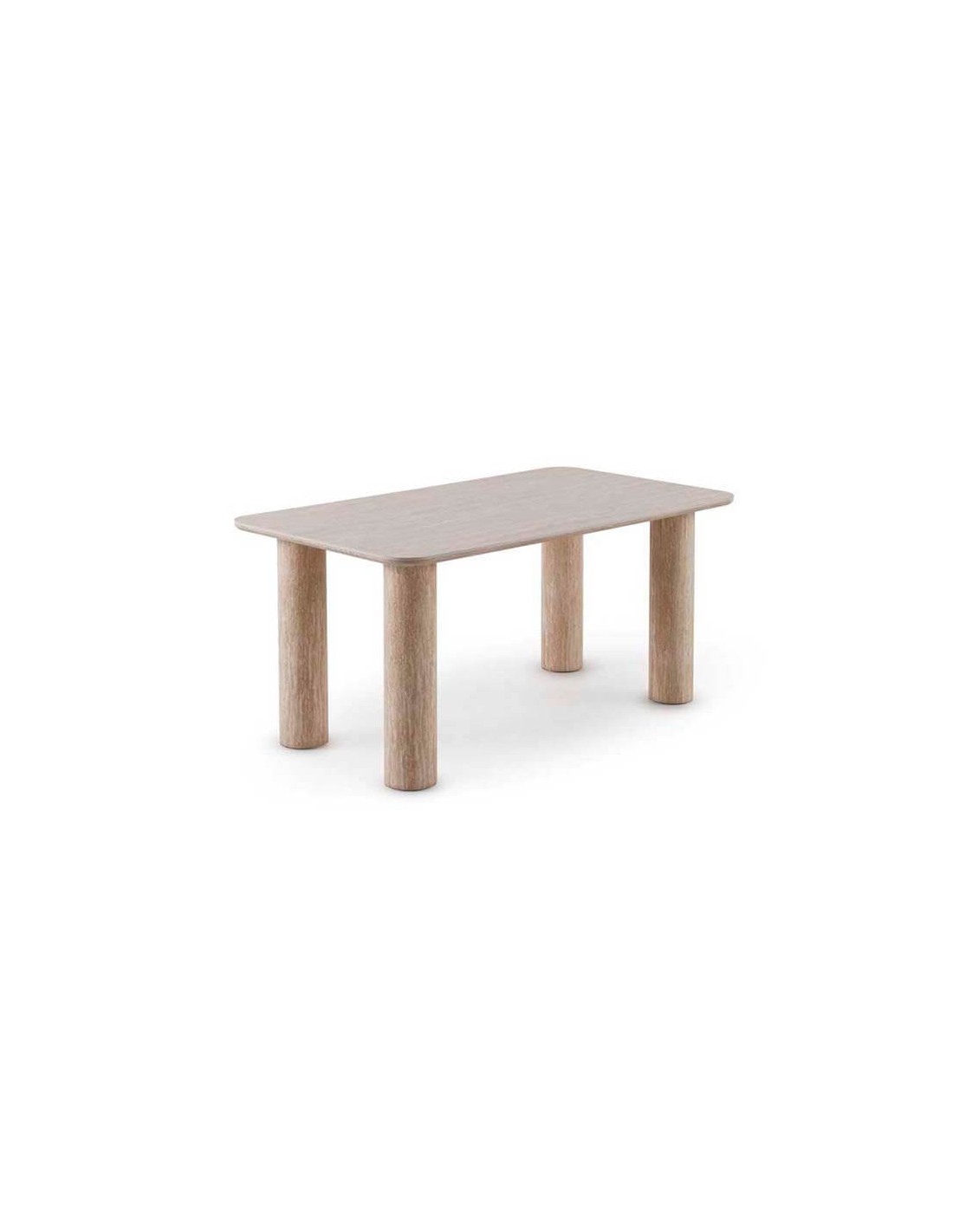 Mesa rectangular para comedores de estilo mediterráneo o contemporáneo. Patas cilíndricas de madera. Tapa rectangular con cantos redondeados, de cerámica de 1 cm de grosor superpuesta sobre un tablero de madera de 2 cm. Acabado mate. Dos medidas para elegir.