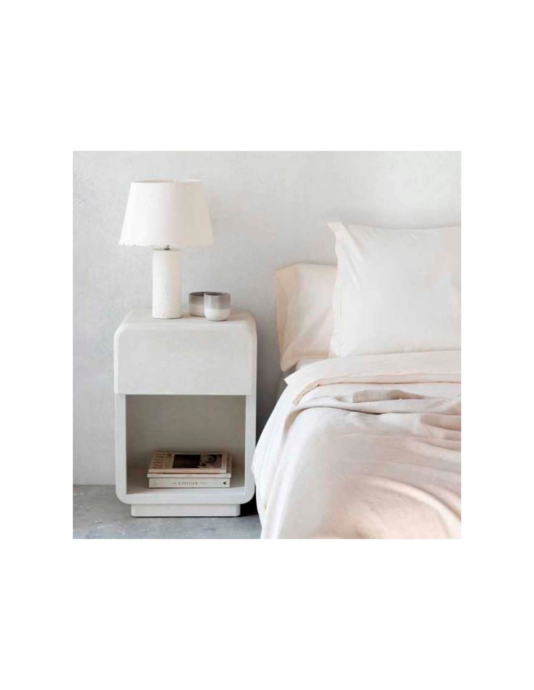 Mesita de noche para dormitorios de estilo contemporáneo, mediterráneo o Boho Style. Fabricada en poliresina y revestida con microcemento de color blanco. Cajón auxiliar con guía de madera. Cantos redondeados.