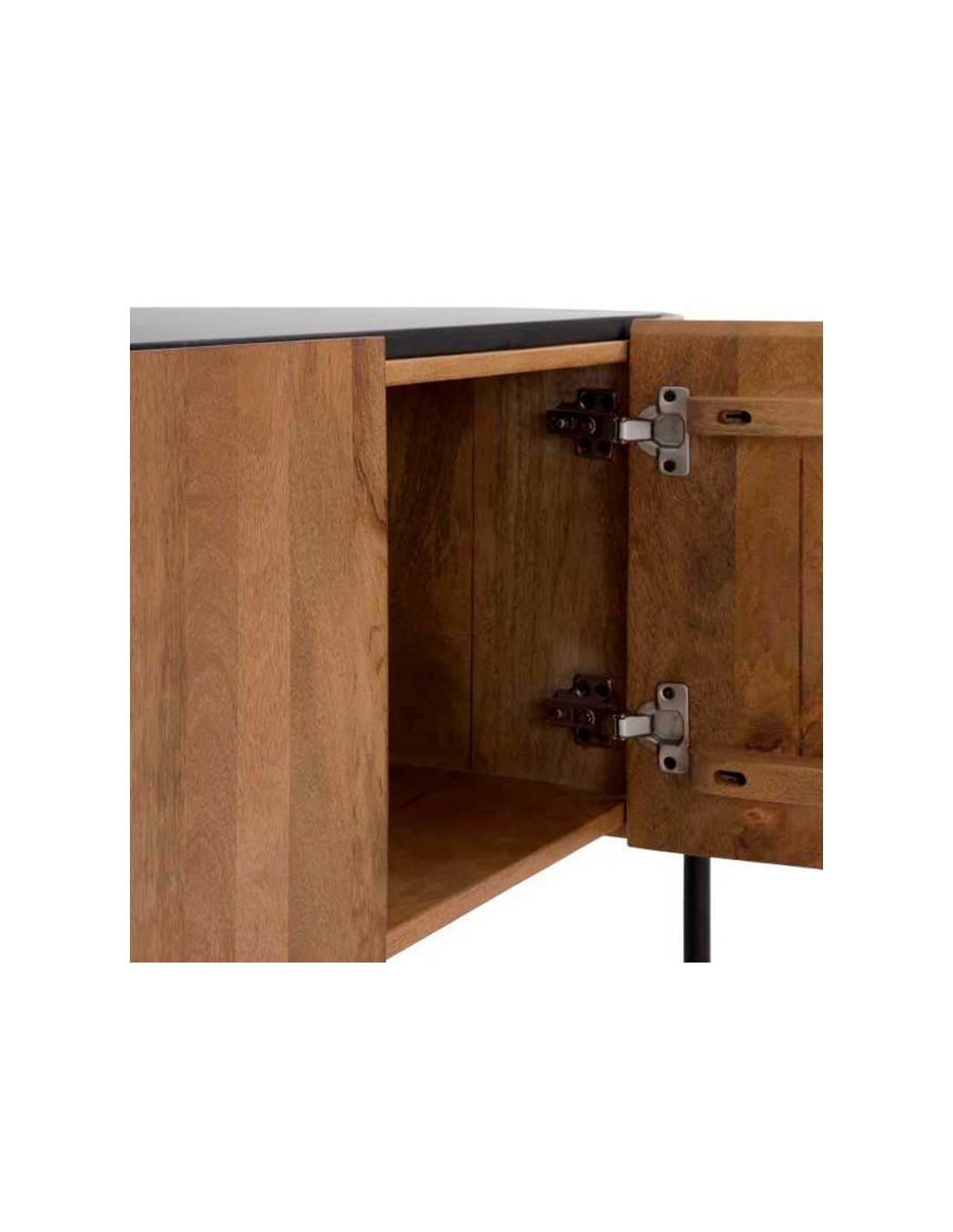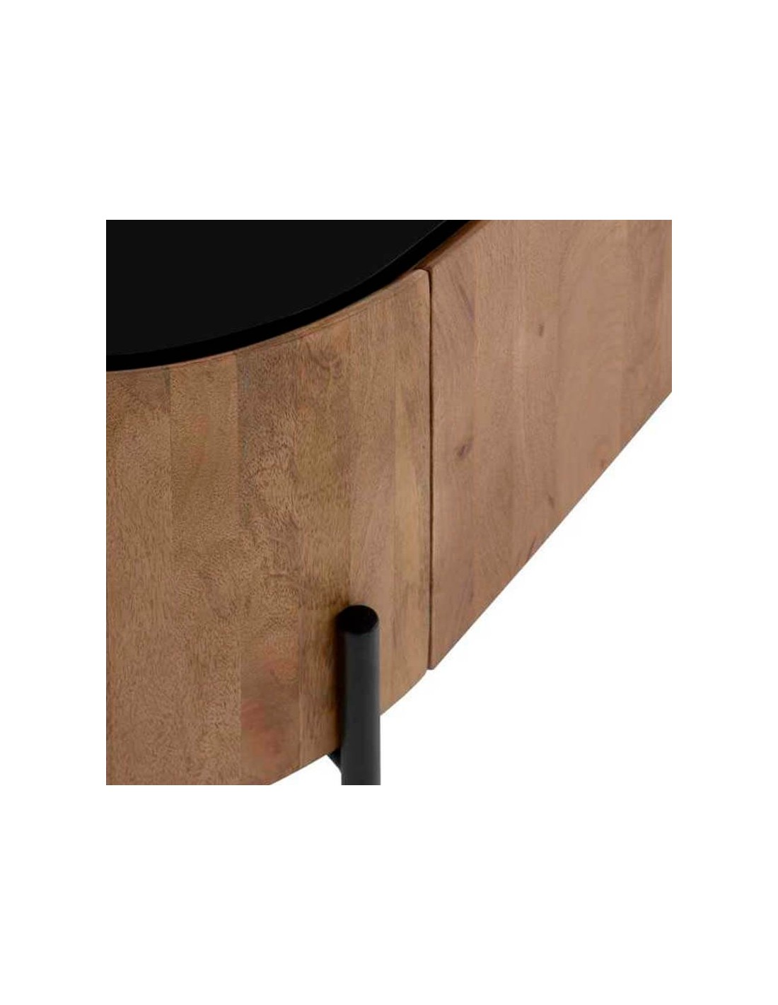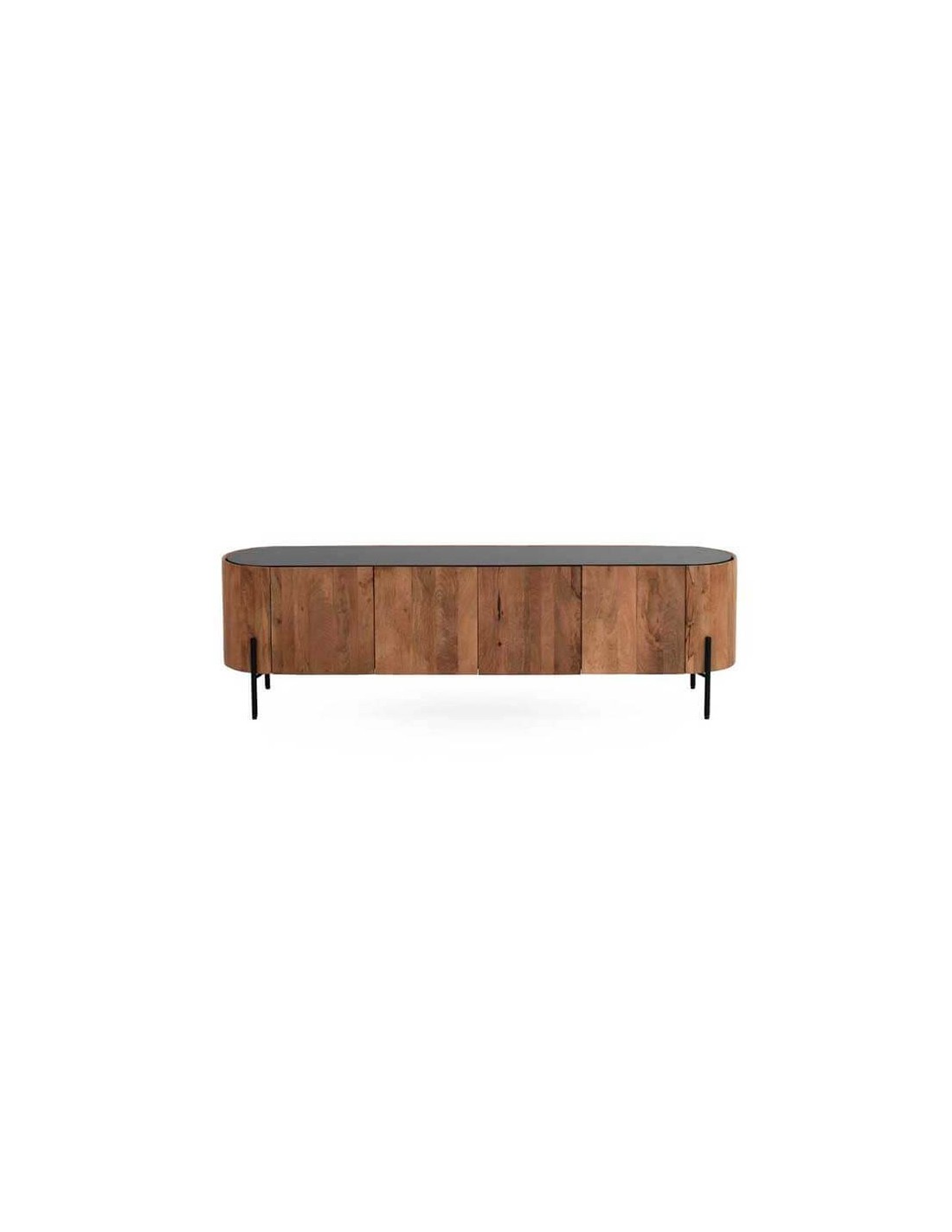 Mueble TV de diseño curvo para salones de estilo contemporáneo. Fabricado en madera de mango de primera calidad con patas de metal en color negro. Puertas con tiradores tipo uñero y bisagra de cierre suave para evitar golpes. Encimera de color negro.
