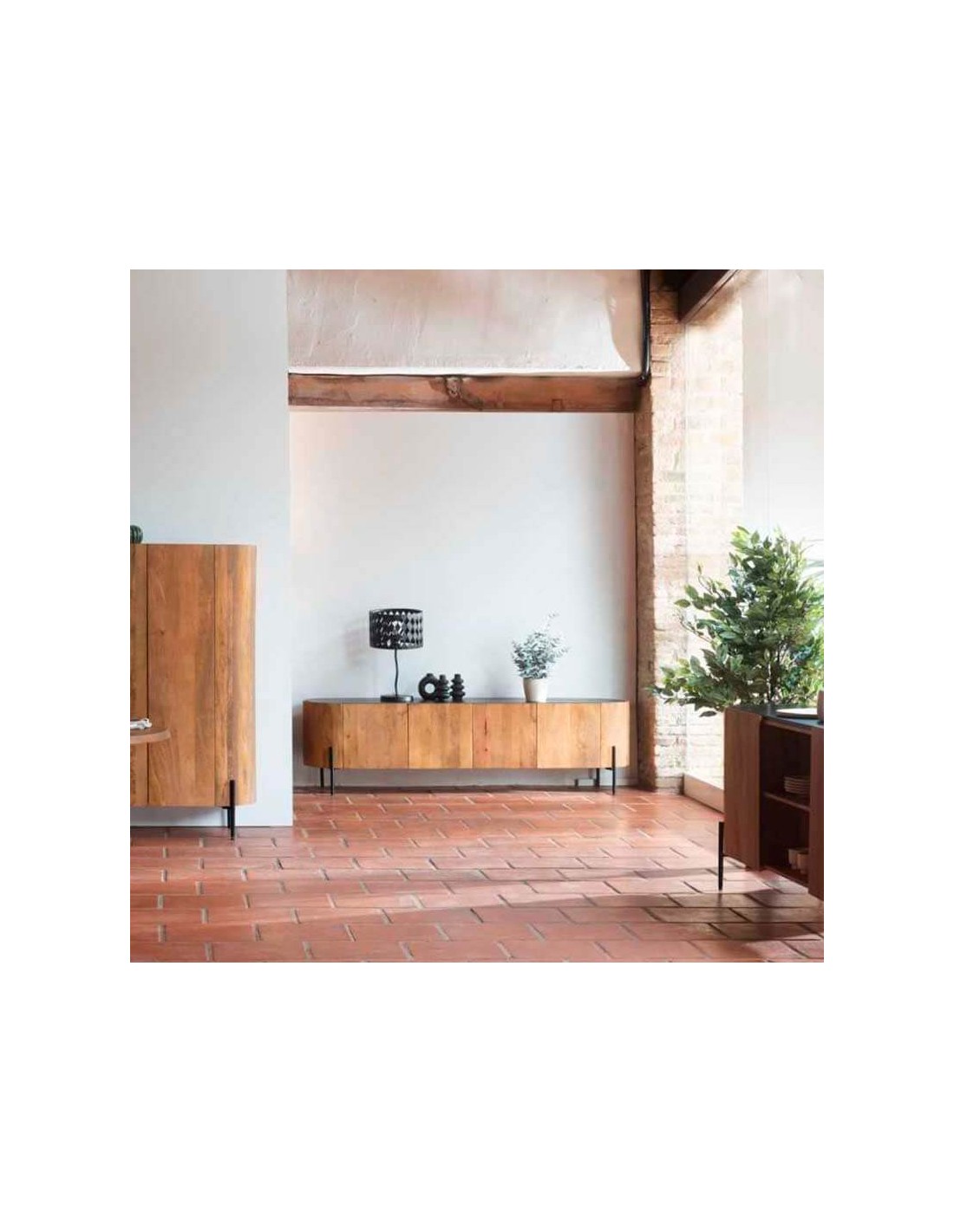 Mueble TV de diseño curvo para salones de estilo contemporáneo. De madera y metal.