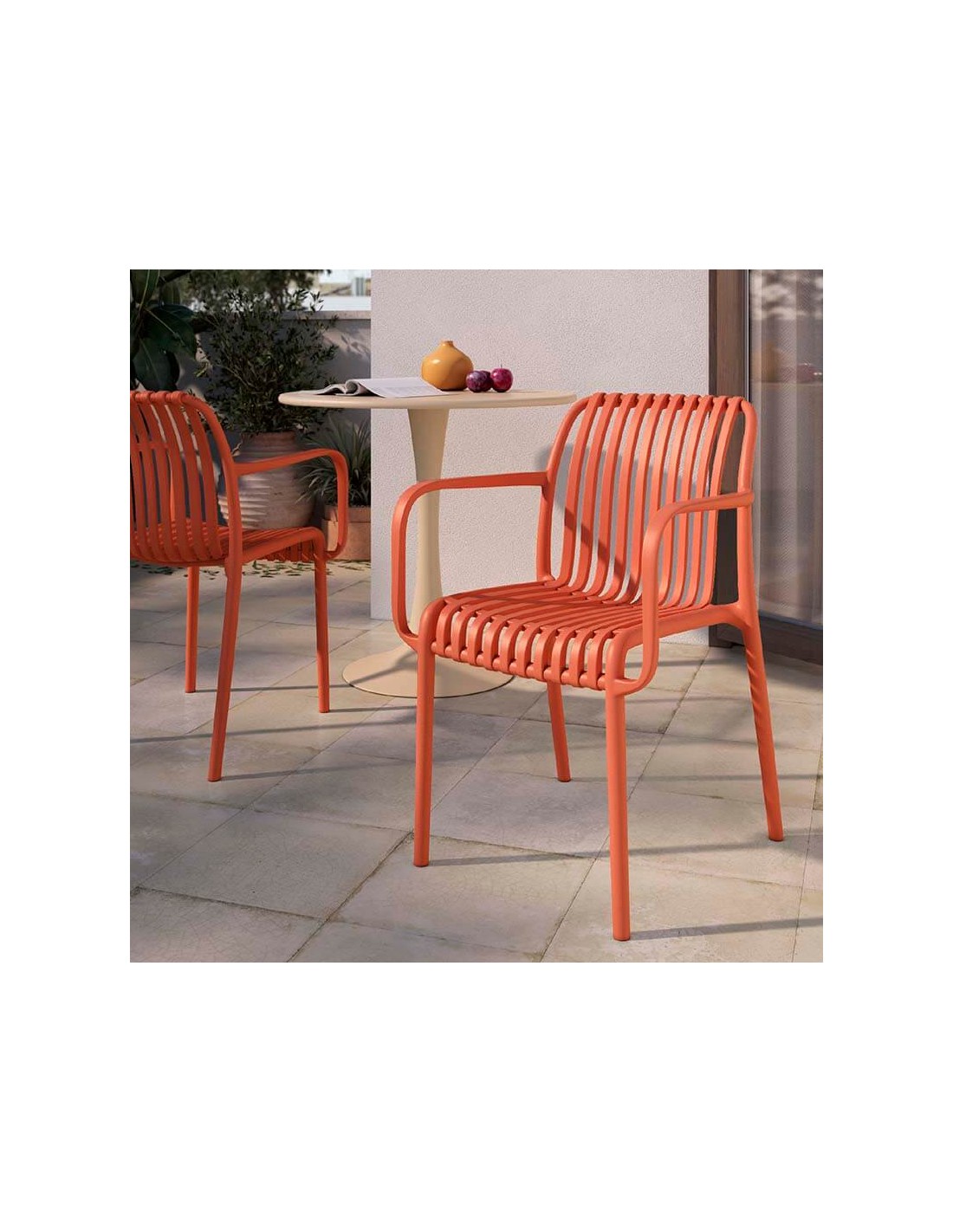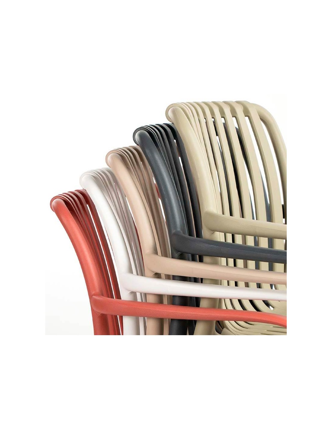 Silla apilable realizada en polipropileno de máxima calidad. Disponible en 5 colores: teja, verde claro, blanco, grafito o arena. Pack de 4 unidades.