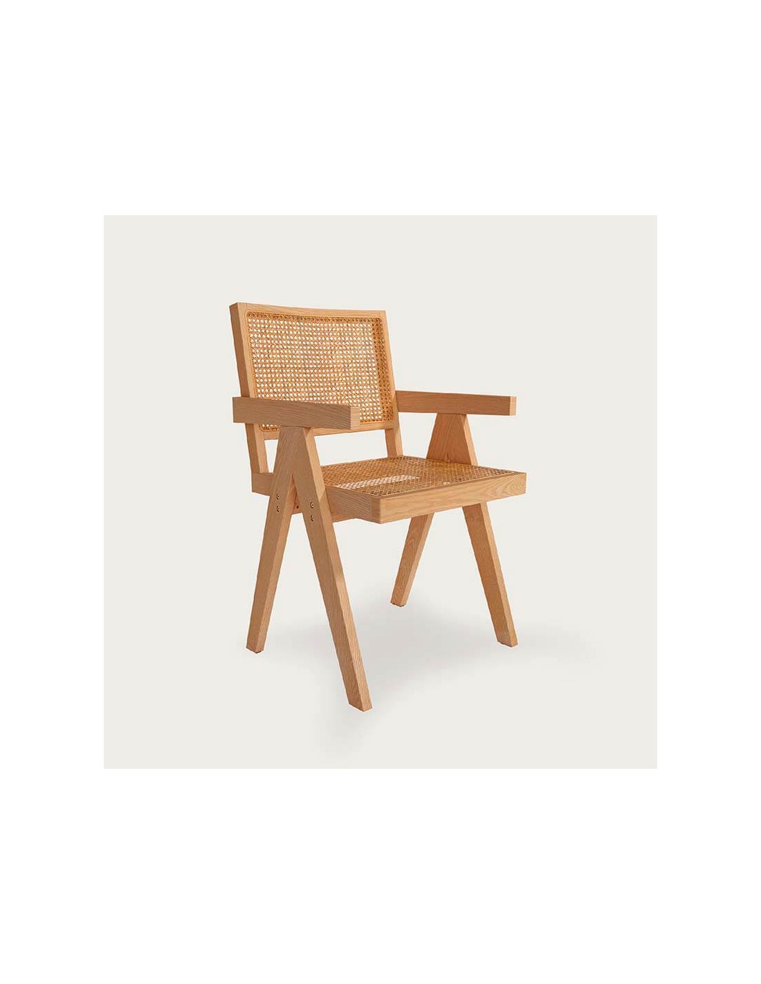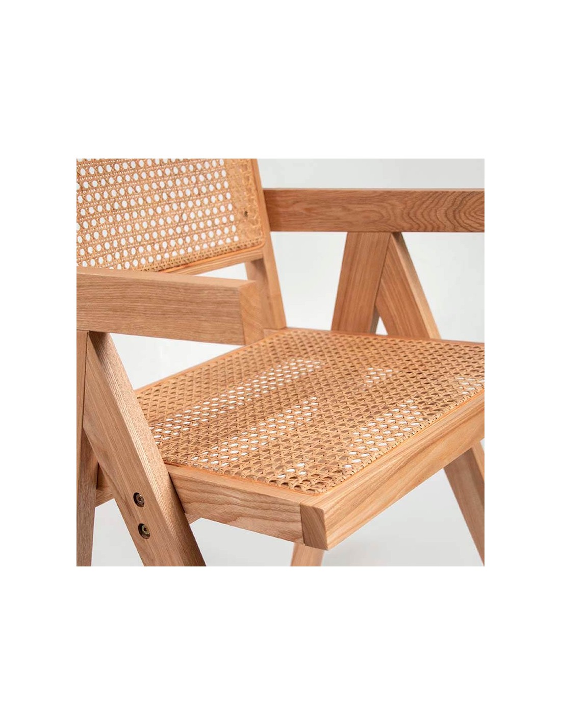Silla de estilo mediterráneo para comedor o salón. Fabricada en madera de fresno combinada con asiento y respaldo de ratán. Disponible en dos colores: negro o fresno natural.