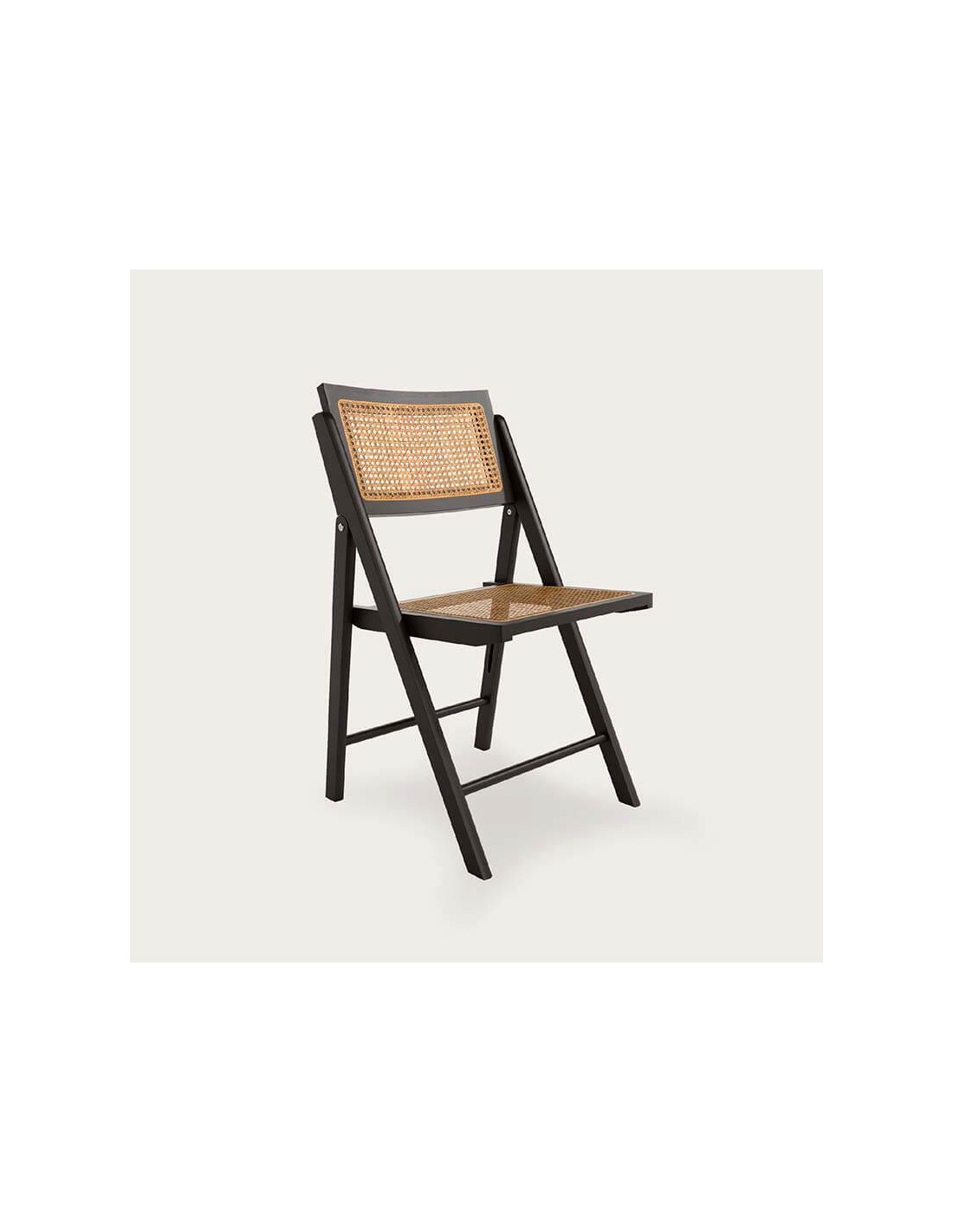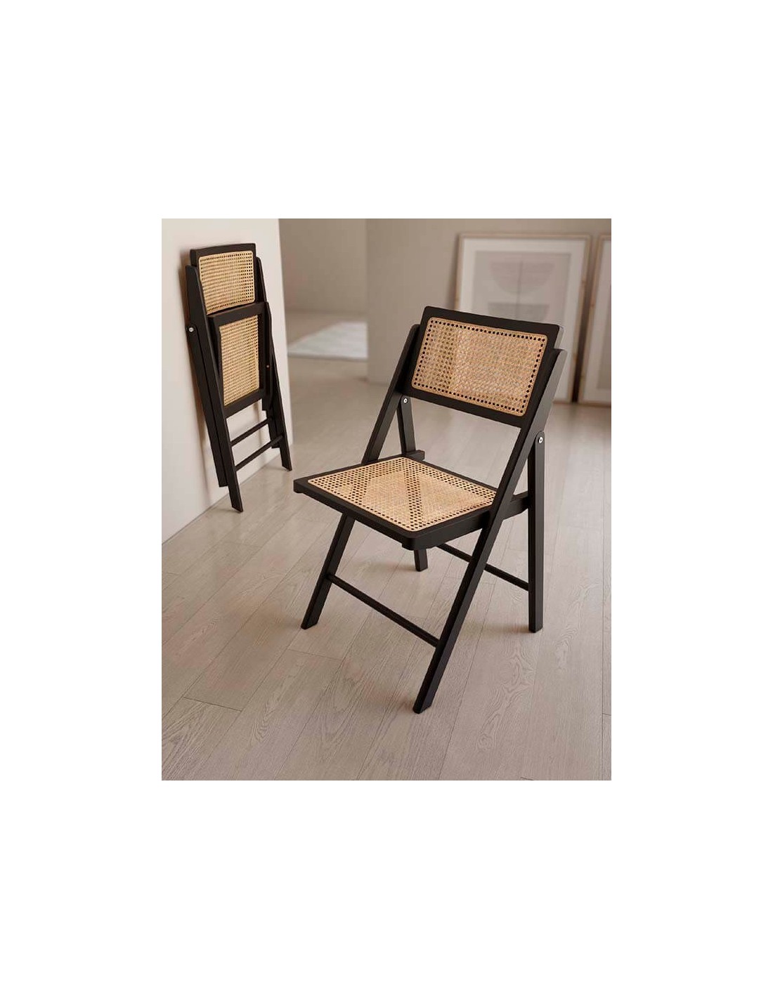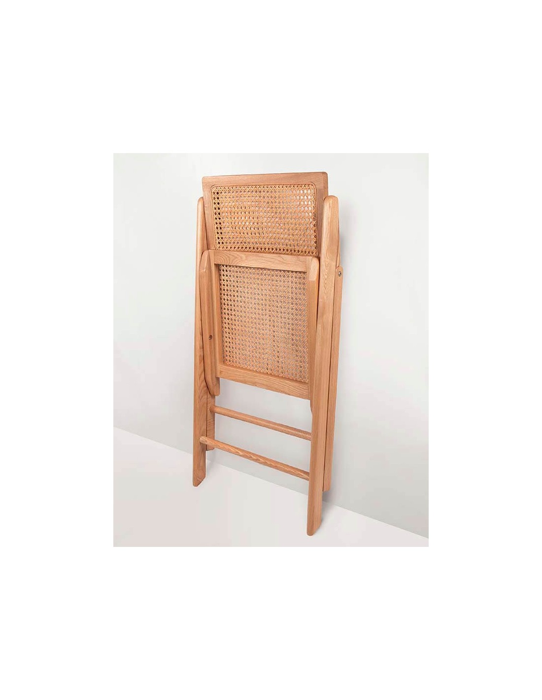 Silla plegable de madera con asiento y respaldo de ratán. Perfecta para combinar en ambientes de estilo mediterráneo o Boho Style. Fabricada en madera de fresno y combinada en color natural o negro.
