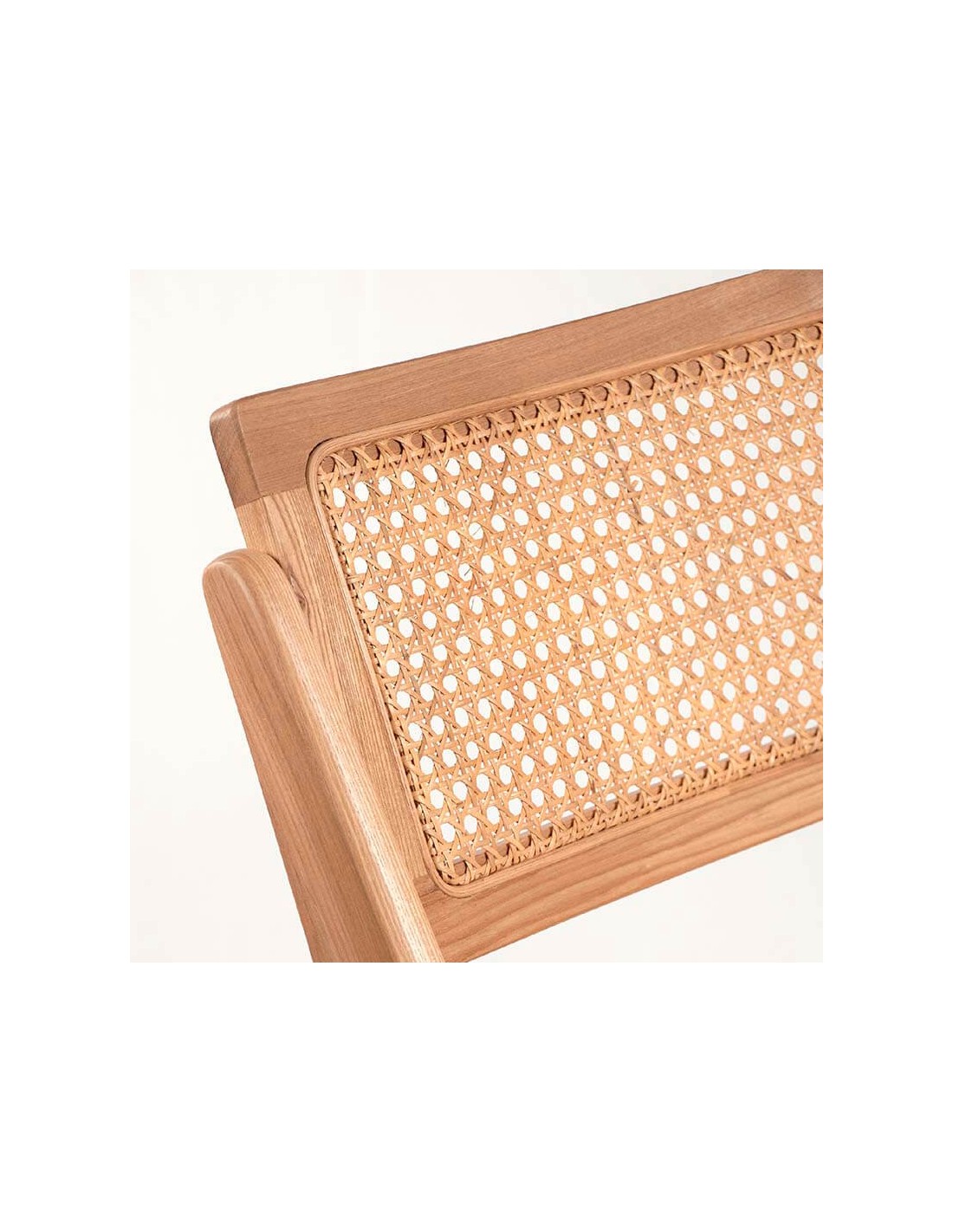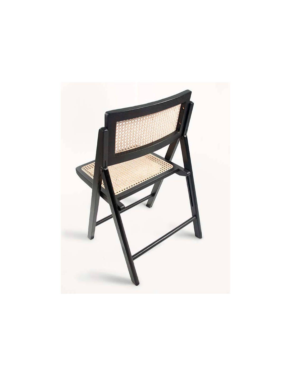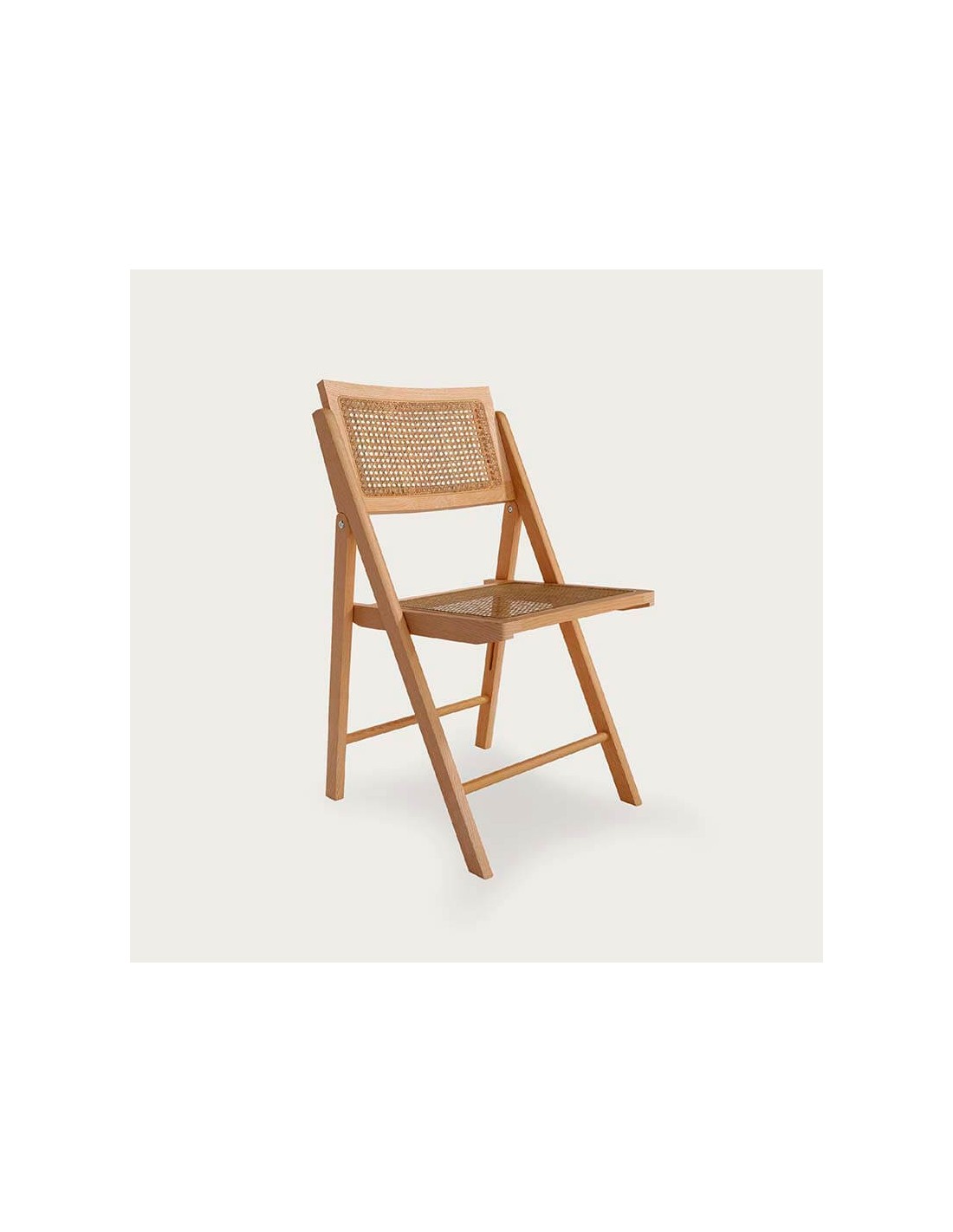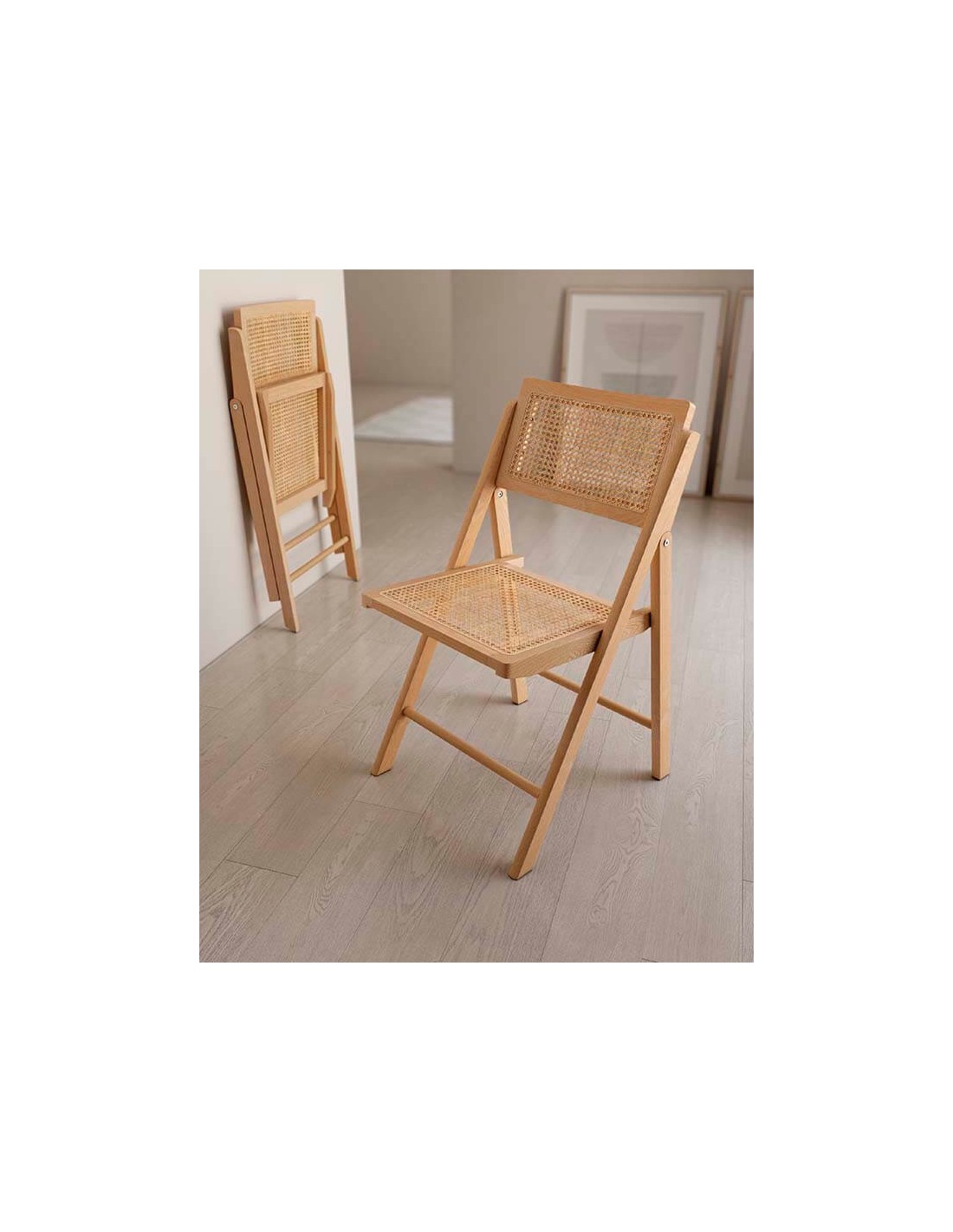 Silla plegable de madera con asiento y respaldo de ratán. Perfecta para combinar en ambientes de estilo mediterráneo o Boho Style. Fabricada en madera de fresno y combinada en color natural o negro.