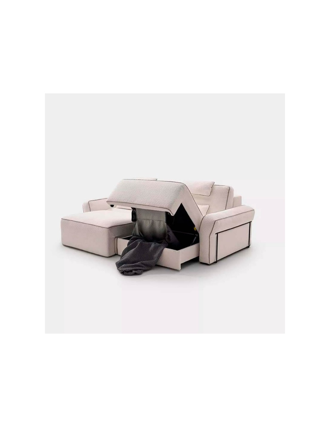 Varias medidas disponibles. En composición de ancho 250 cm, el sofá incluye una funda protectora pensada para cubrir el asiento cuando se utiliza como cama. Esta funda se guarda discretamente en un bolsillo con cremallera escondido dentro del arcón.